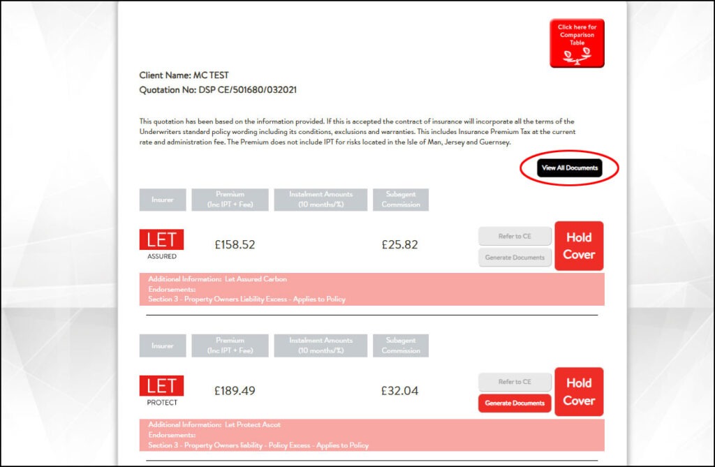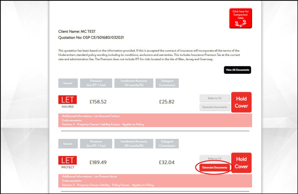 Once you are at New Business stage on Assist, you will automatically receive the documents by email for the selected scheme at the top of the page. If you require the documents for the alternative schemes, please locate the quote you require and then click on the ‘Generate Documents’ button as seen below. These will now also be emailed to you.