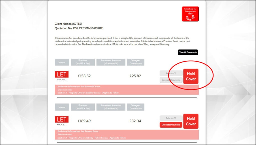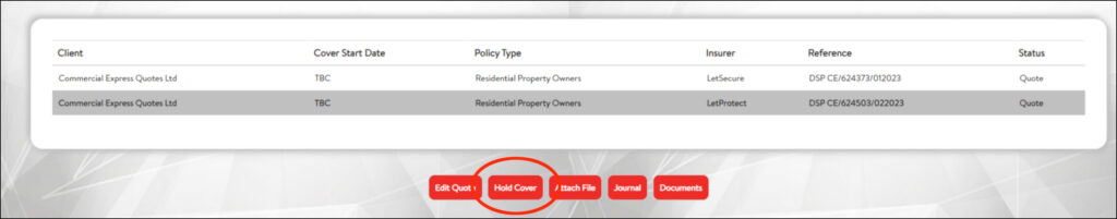 At the end of the quotation, when a premium and terms have been issued, you will see a ‘Hold Cover’ button.