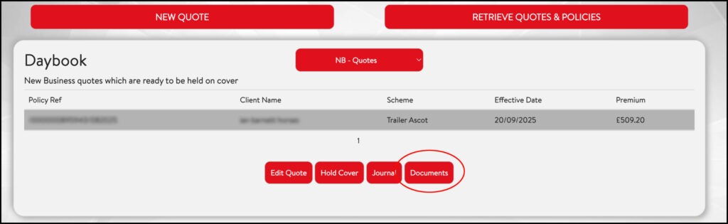 You can access your documents directly from the Daybook. Simply select the policy you require and click ‘Documents’.