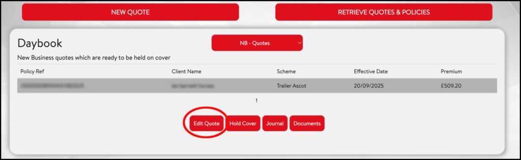 You can access and edit a quote from the Daybook. Simply select NB quotes from the drop-down and click edit quote.
