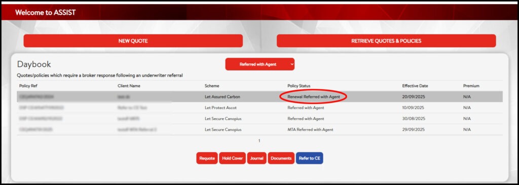If we require additional information on a renewal, or when a renewal has been authorised and is with you as the broker, the status of the renewal will be Renewal Referred with Agent, which you can access from the drop-down menu, under ‘Referred with Agent’.