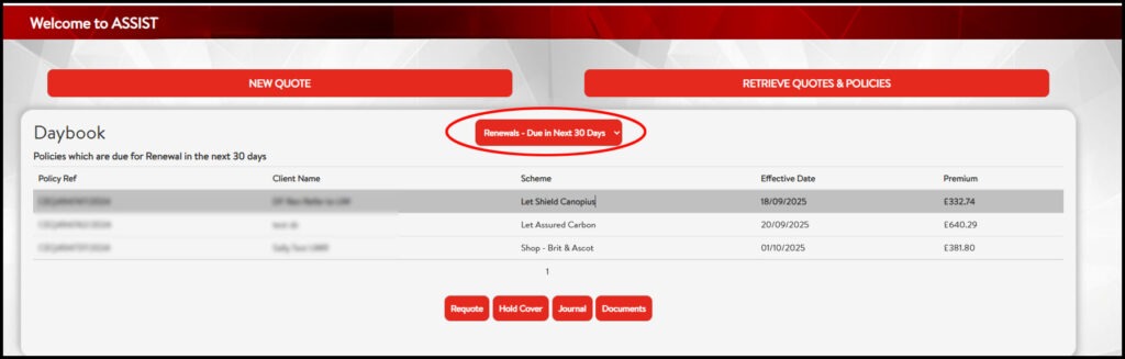 You will be able to see all your renewals due in the next 30 days from the Daybook once selected from the drop-down menu. If you need to advise us of any information or make any changes to the policy, simply amend the renewal information by pressing Requote. This will take you into the policy itself and allow you to advise or make changes.